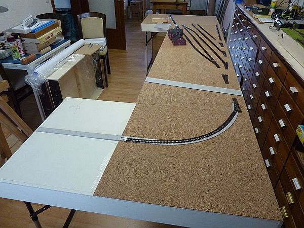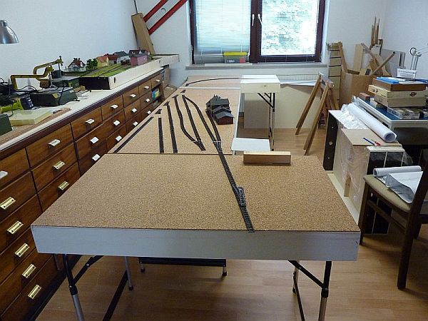 werden die Gleise auf eine mit Korkplatten beklebte Module gelegt und fixiert.